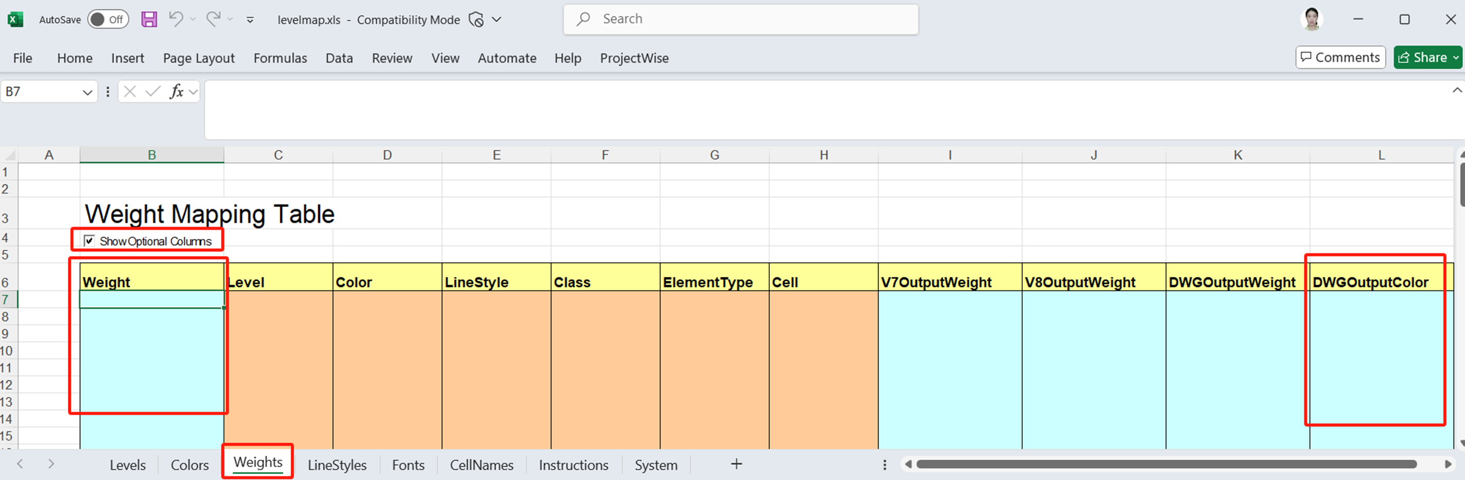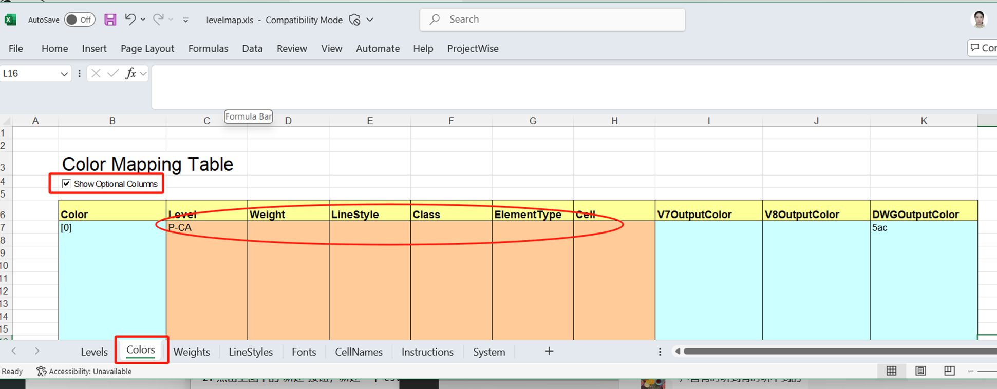 其中 Color~Cell这几列需要输入元素在DGN文件中的属性,最后一列 DWGOutputColor中需要输入的是保存为DWG文件后要改成什么颜色。