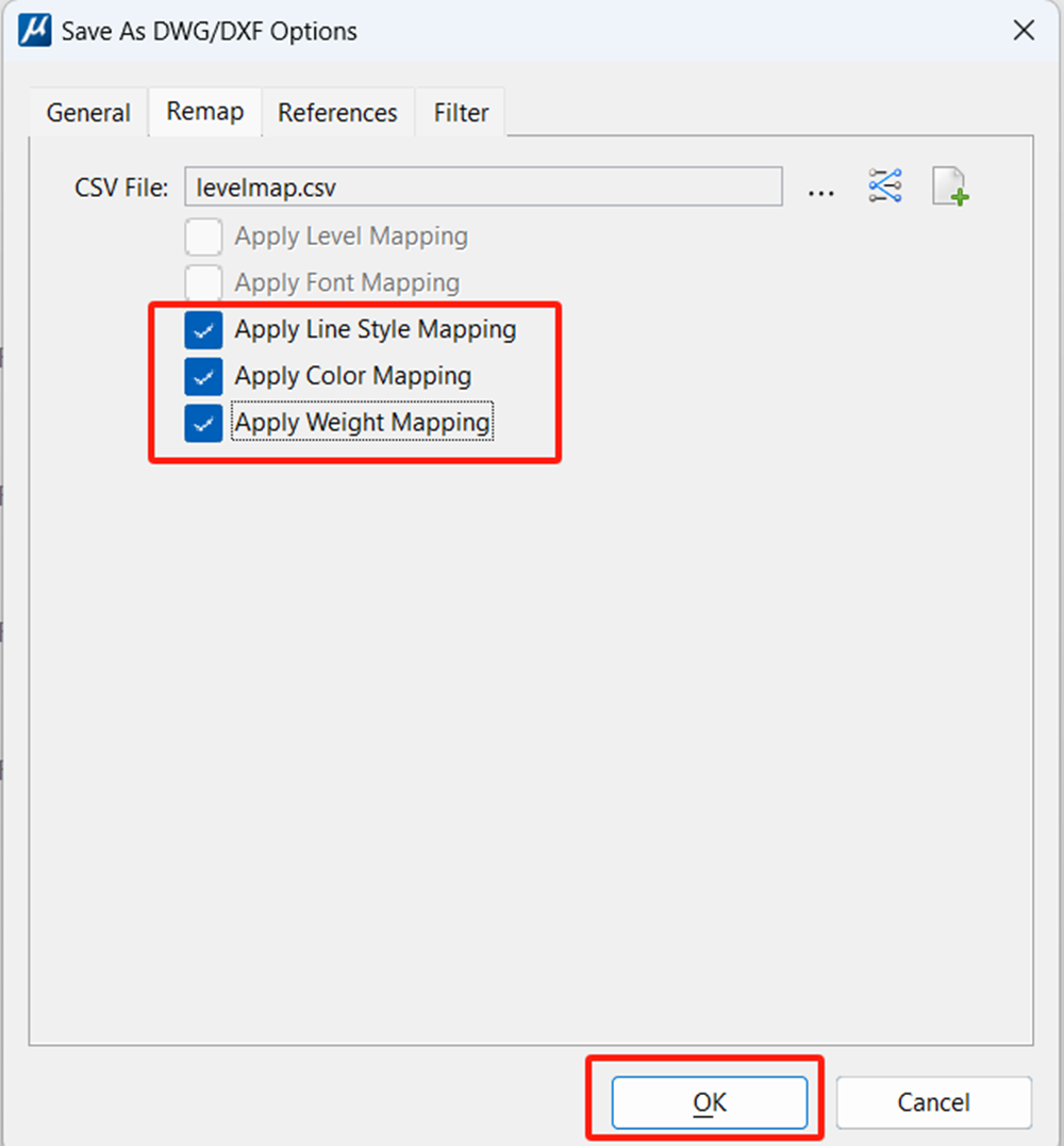 6. 将这个CSV文件设置好后,勾选如下三个选项,点击OK后就可以进行dwg的保存了。