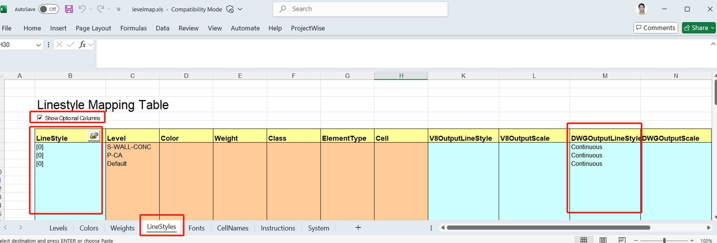 ※ 其中第一列LineStyles是必填项,其他Level~Cell根据您的条件选填就行。