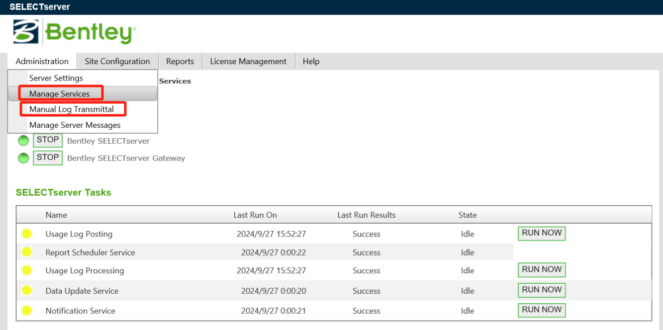 1. 请登录SELECTserver 管理页面:http://localhost/bss/admin/default.aspx ,打开Administration->Mange Service,然后点击以下4个服务按钮。