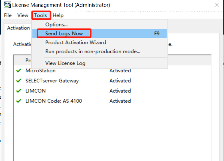 3.如果近期未使用任何软件,可以在服务器端的License management tool里点击tools->send logs now,这时会上传SELECTserver gateway的用量(免费产品的用量)。
