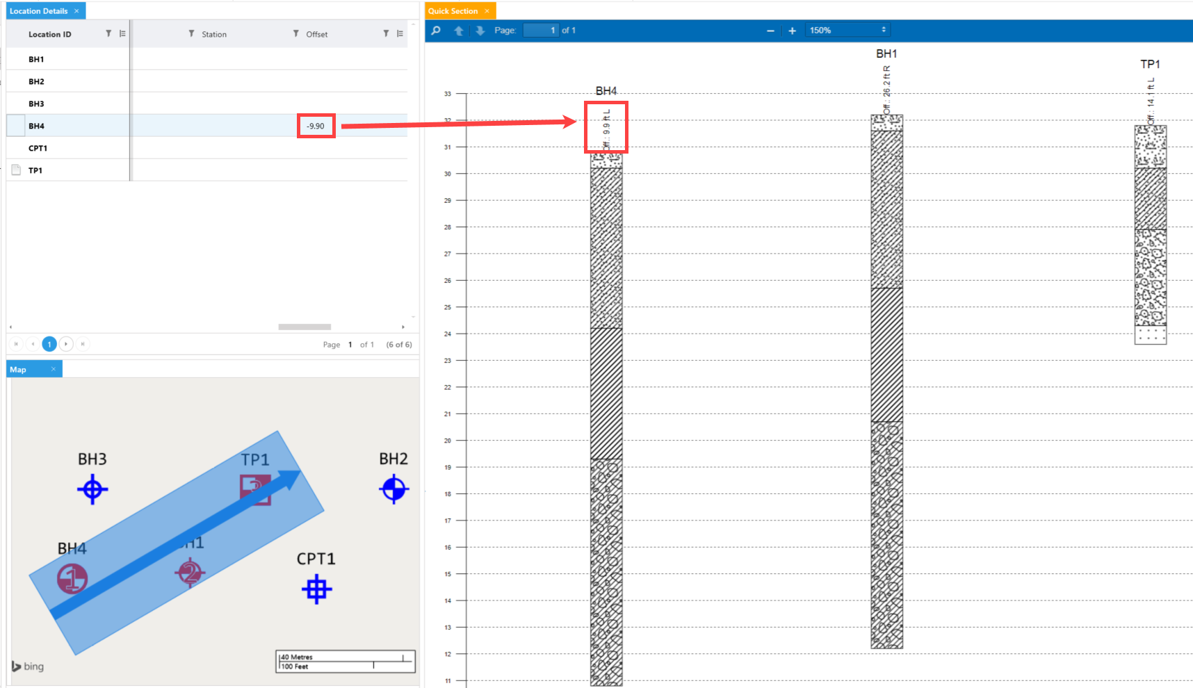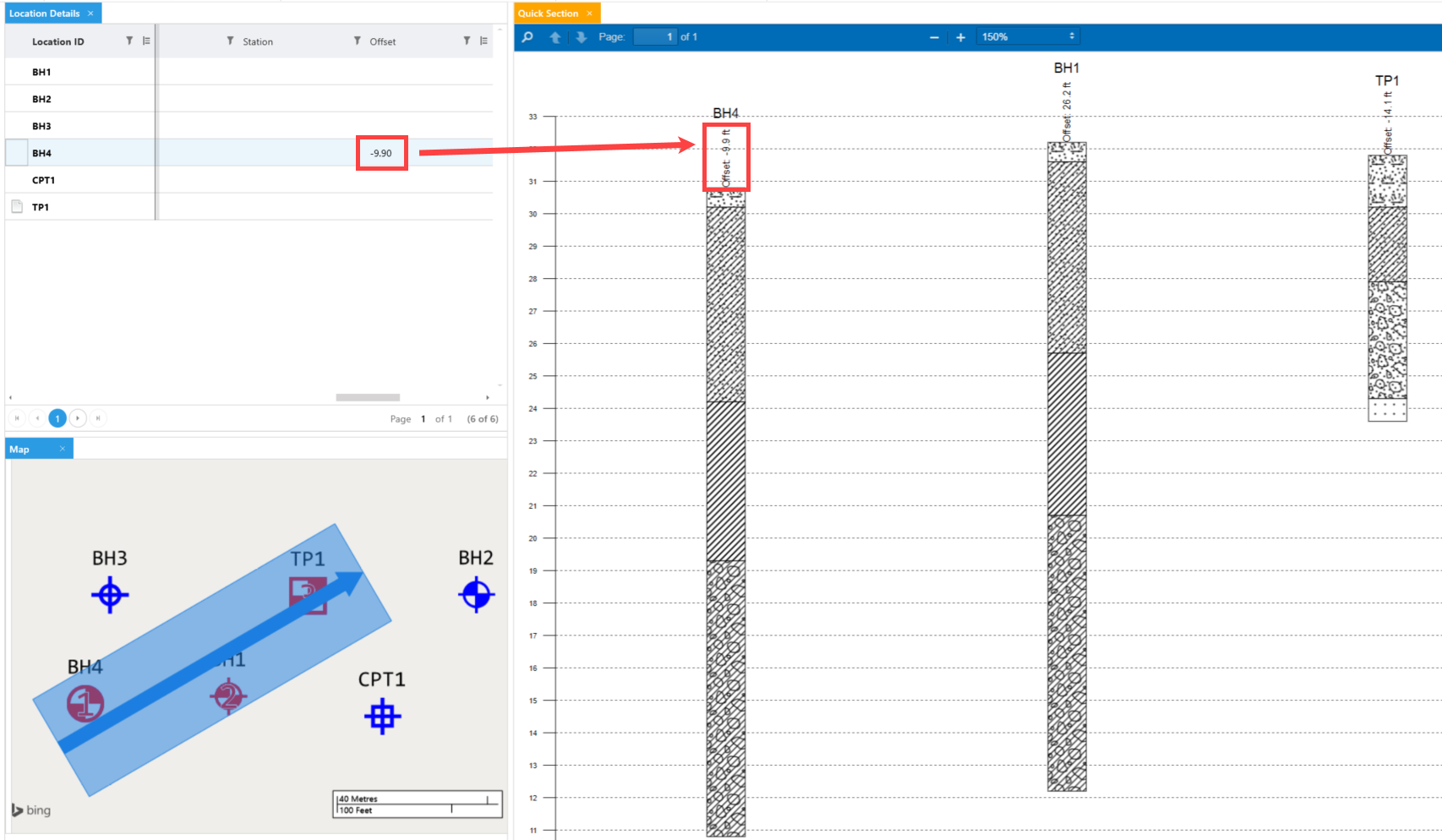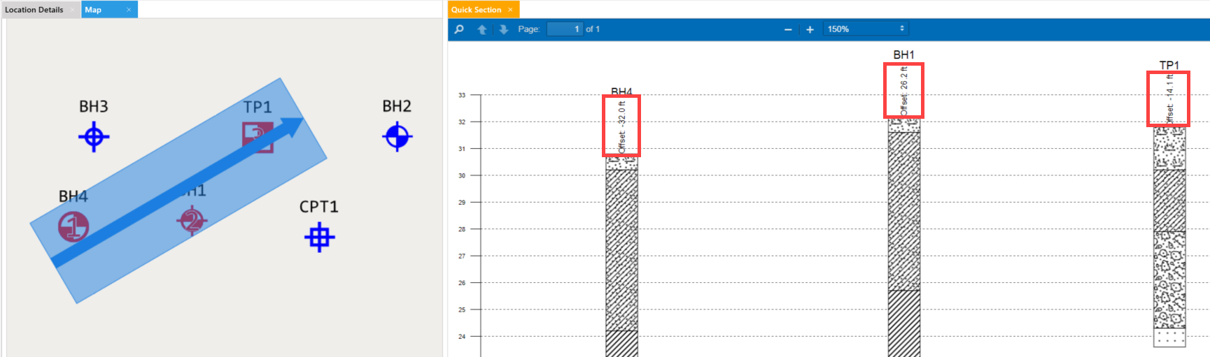 This expression will return the offset for each Location to 1 decimal place. In this example (and others below), it is used in a Header Data Text item in the header area of the Strip. A positive offset indicates the Location sits to the right of the Section Line and a negative offset to the left (looking along the Section baseline from starting point to end point).