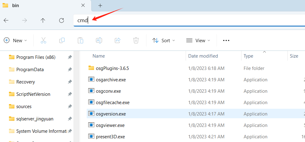 打开DOS窗口的时候,可以在如上目录的资源管理器上部的输入栏直接输入 cmd 命令后按回车键,就能直接打开DOS窗口,并且位于此目录下,这样就可以直接输入osgconv.exe 命令,而不用使用dos的cd命令去更换目录了。