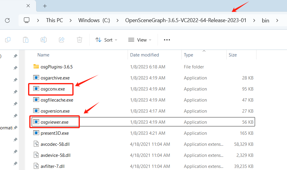 下载后的文件名字是:OpenSceneGraph-3.6.5-VC2022-64-Release-2023-01.7z,可以将此文件直接解压缩到C盘根目录下,然后在如下文件夹下能够找到 osgconv.exe和osgviewer.exe 这两个工具