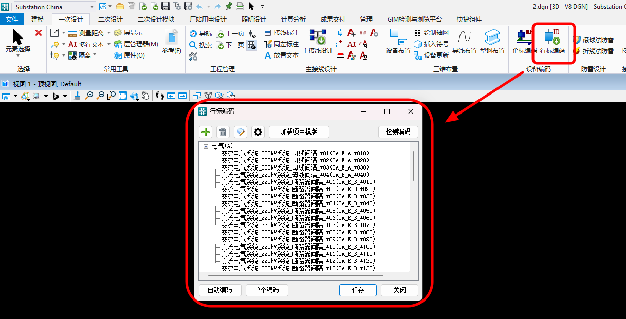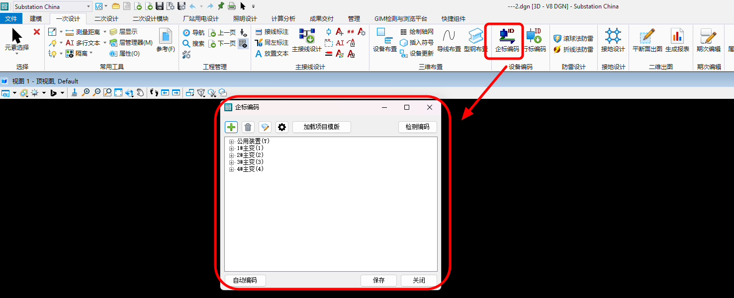 1.使用“企标编码”或者“行标编码”对布置好的设备、导线进行编码,这里需要打开每一张图纸分别进行编码: