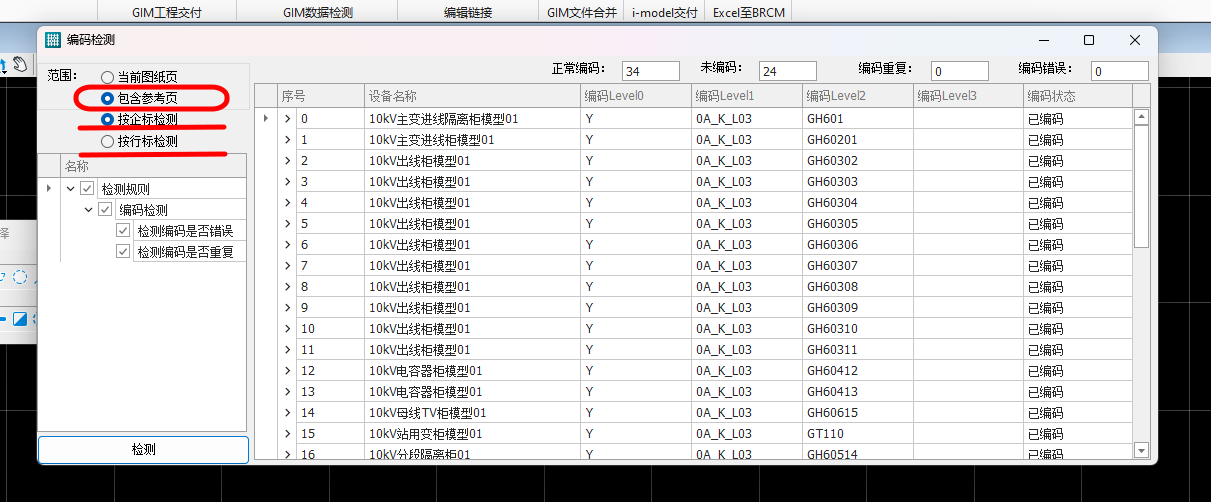 可以在总装图纸中,选择范围“包含参考页”来对所有电气设计图纸整体检查;也可以在单个图纸上,选择范围“当前图纸页”进行检查;整体检查均显示“已编码”后,方可进入下一个步骤,否则应返回对应图纸对错误编码的模型进行处理。