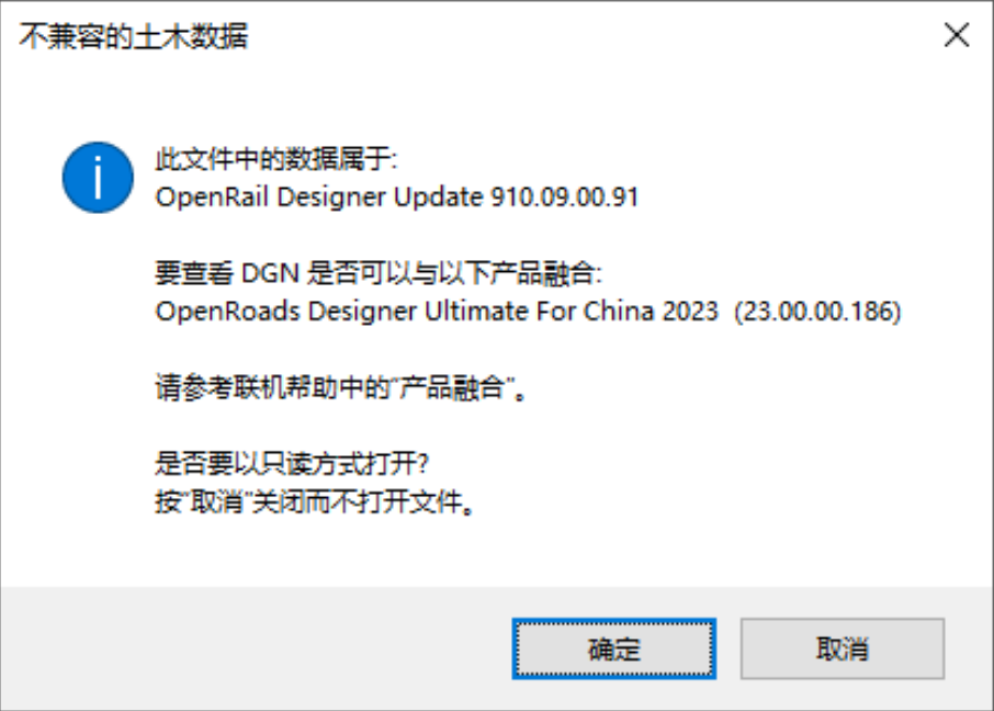 用 OpenRoads Designer 打开 OpenRail Designer 的文件,遇到下面“不兼容的土木数据”的报错,需要用到“产品对齐”功能:
