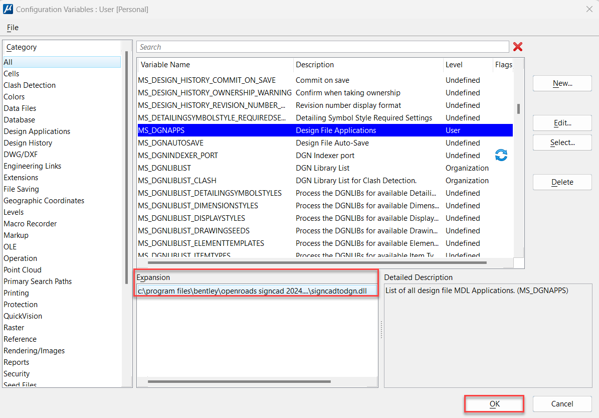 4) The SignCADTODGN.dll path will now display under the MS_DGNAPPS Expansion. Press OK.