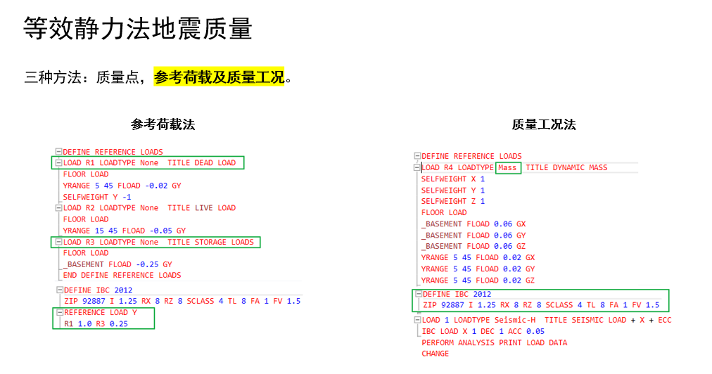 常用的就是参考荷载法和质量工况法。