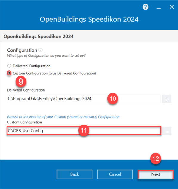 - We recommend choosing the Custom Configuration (plus Delivered Configuration). Please also refer to the chapter Side-by-Side installation in the Readme if you have already installed OpenBuildings Speedikon 2023.