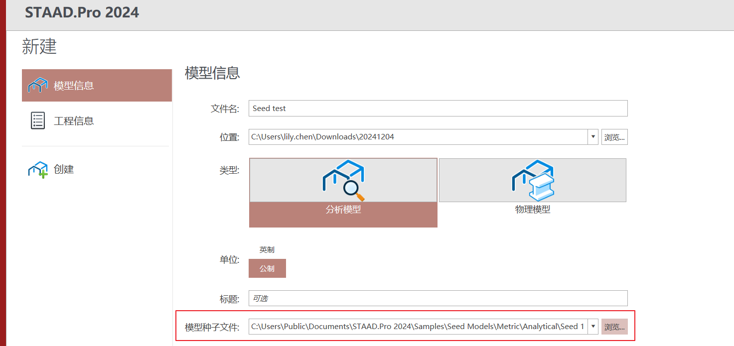 选择“新建”选项来创建一个新模型,在“模型信息”下,添加存放种子文件的文件位置。