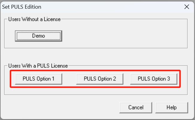 3.打开PULS后将会弹出以下窗口,根据您购买的产品类型,您可以选择PULS Option 123 许可类型。