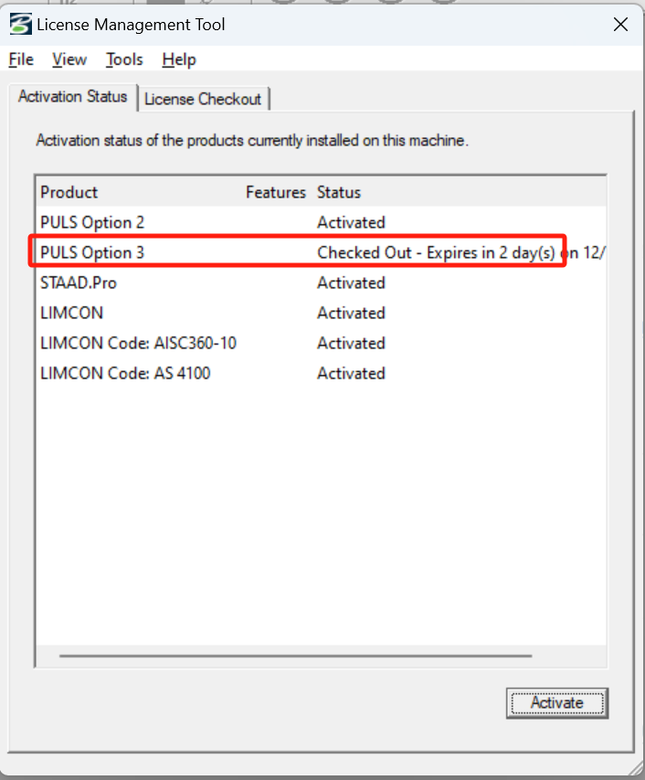 4.因使用IEG许可服务的产品是默认检出许可,因此打开PULS软件后,在license management tool (C:\Program Files (x86)\Common Files\Bentley Shared\IEG\IEGLCS里启动licensetool.exe)里显示的许可状态是已检出(checked out)状态, 即可确认已正常激活许可。