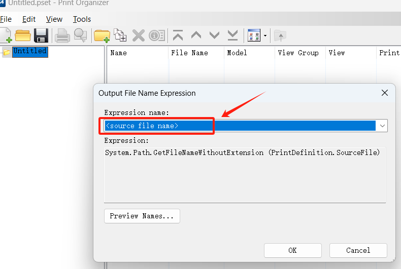 生成的PDF文件名字的格式是保存在.pset中的,这个.pset文件是一个外部文件,独立于DGN,通过Pirnt Organizer的菜单 File> Default print Definition Name 和 Out File Names中的Expression Name都保存成如下的 <Source File name>,然后保存这个.pset文件,下次批打印只要使用这个.pset文件的话,生成的PDF文件的名字就是DGN文件的名字了。
