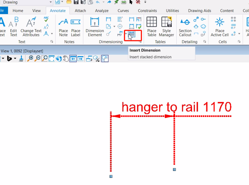 1. 如果想向左拖动的话,那么在原有标注的左侧先增加一个不带有关联点的标注位置,使用工具:Drawing> Annotate> Dimensioning> Insert Dimension: