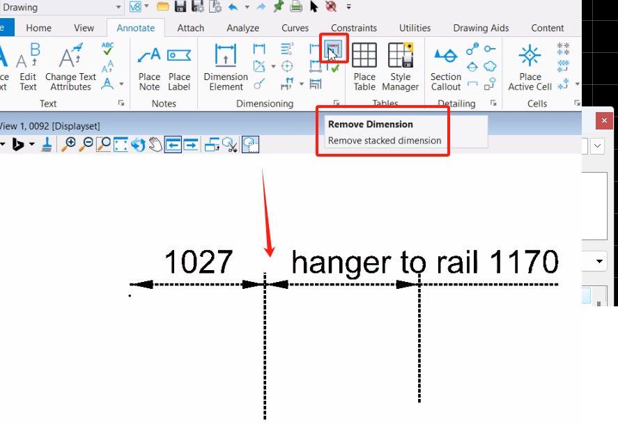 2. 然后再使用 Remove Dimension (Drawing> Annotate> Dimensioning>)工具将左侧原来带有关联点的标注给删除掉;