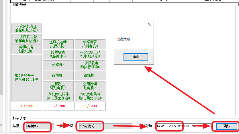 在下方选择柜子类型、厂家、型号,点击确认进行选型,提示选型完成: