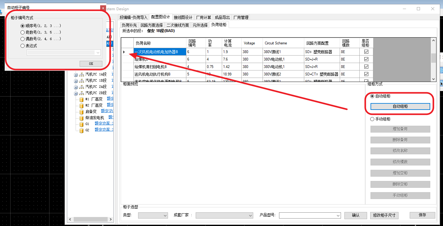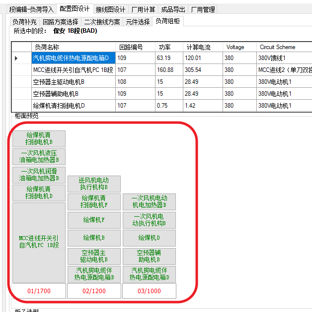 在元件选择以后,可以进行负荷自动组柜,软件可以将不同大小的负荷回路自动排布在开关柜中。