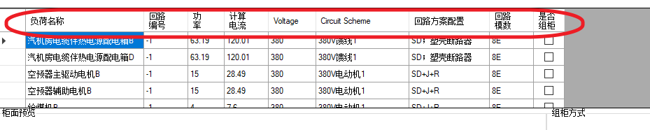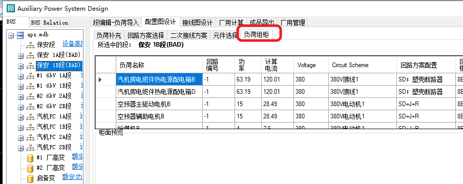 2.在左侧段(BUS)中,选择段,右侧上方会列出当前段所有的导入负荷与补充负荷,以及其基本电气参数,如功率、电流、电压等,此外,还会显示回路方案、回路模数和是否组柜: