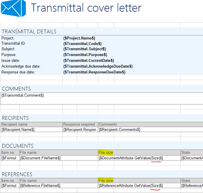For example, if you add an attribute named Size (meaning file size) to the list of transmittal attributes and you want that attribute to be displayed for each document listed in the cover letter, then you need to add a "Size" or "File Size" column (the column name can be whatever you want) to the DOCUMENTS table and under that column enter the {$DocumentAttribute.GetValue(Size)$} variable. If you want the same Size attribute to be displayed for each reference listed in the cover letter, then you need to add a similar "Size" or "File Size" column to the REFERENCES table and under that column enter the {$ReferenceAttribute.GetValue(Size)$} variable. Remember, whatever you name the attribute in the portal settings, the same name must be specified in the GetValue parameter of the variable. In other words, if the attribute name is File Size, then you must use GetValue(File Size) in the variable.