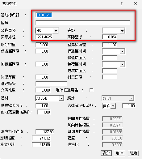 4.点击“插入--特性--管线特性”新建一个名字为Elbow的管线,同时,选择公称直径为“NS” 管线的外径和壁厚需要通过弯头前后管道的参数之和的平均数算出
