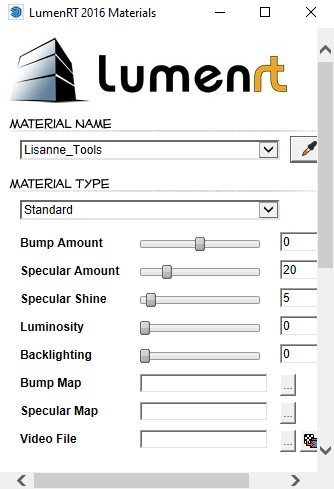 SketchUp LumenRT Material Editor - LumenRT provides an enhanced LumenRT Material Editor directly inside of SketchUp. The LumenRT Material Editor is accessed by going to the SketchUp menu Plugins>LumenRT>Edit Materials. The LumenRT Material Editor contains all of the active materials used in the SketchUp model. Each material is accessible from the Material drop-down control or by using the LumenRT Material Editor Picker to select materials from objects in the scene.