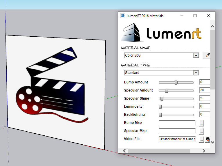 Creating Video Clip Objects- The LumenRT Material Editor allows users to embed video clips as textures on a SketchUp object. To do this, access the LumenRT material Editor and load in a video using the video filw browser control. You may need to adjust the positional mapping of the video on the SketchUp object by using SketchUp's imageadjustment controls (right-click texture > position).