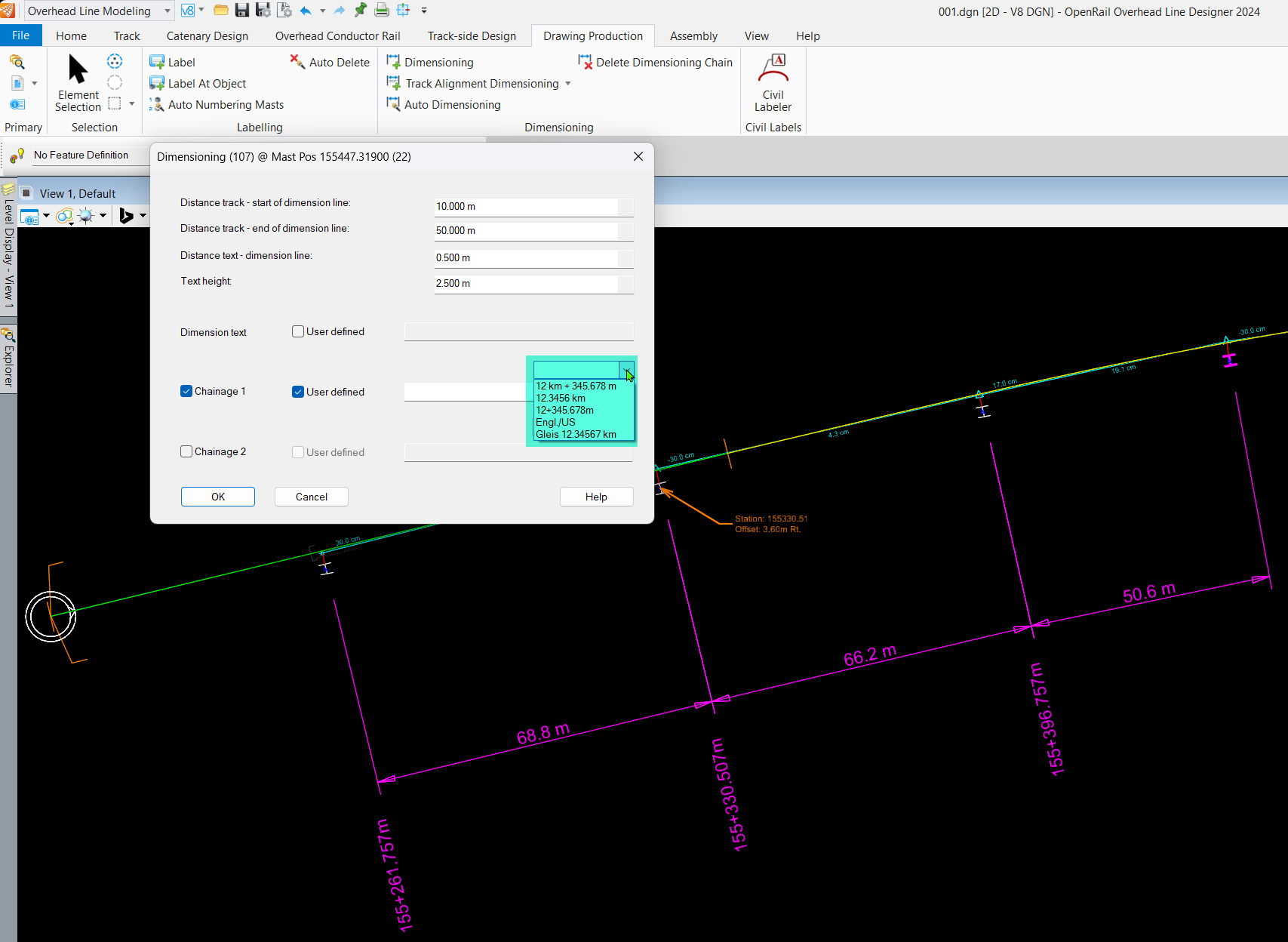 When using Auto Dimensioning command from Overhead Line Drawing Production ribbon, you can add User Defined Chainage. There you've got a drop down list with some preset formatting. How can you add formatting in the list ?