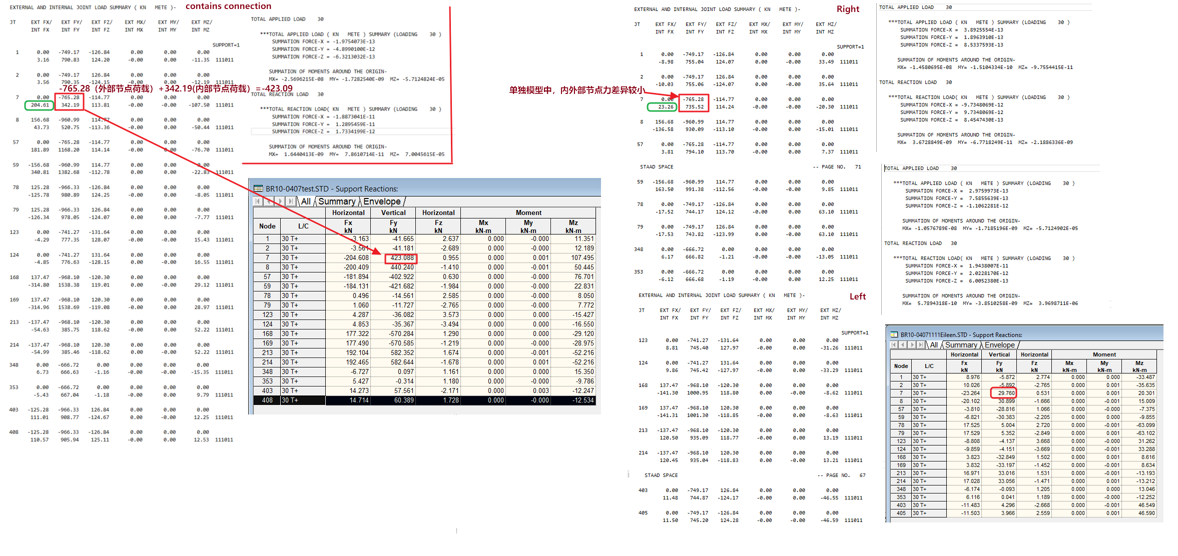 而由于连接影响到了模型整体的变形,因此加载后,其几何形状变形较大,因此产生的内部节点荷载和外部节点荷载差异较大。因此其得到的温度荷载的支座反力差值较两个完全独立的模型的支座反力有较大差异;