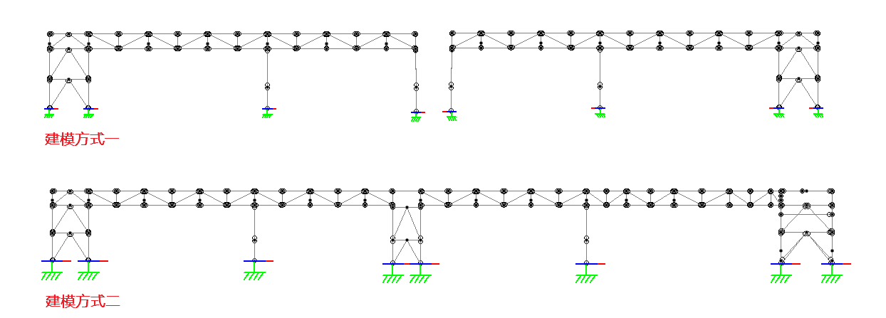 而这两个模型支座反力的差异也正是由于两种模型模拟情况下,内部节点荷载的差异导致的。模型中内外节点荷载差异较大的点,正好是带有连接模型的两侧边榀支座节点;注意:内部节点荷载与结构的几何配置和支撑条件有关。