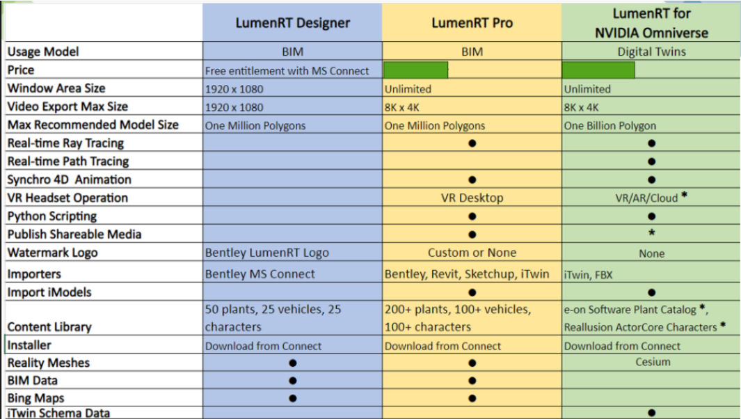 下面的图表帮您理解LumenRT Designer、LumenRT Pro、LumenRT for NVIDIA Omniverse软件之间的差异: