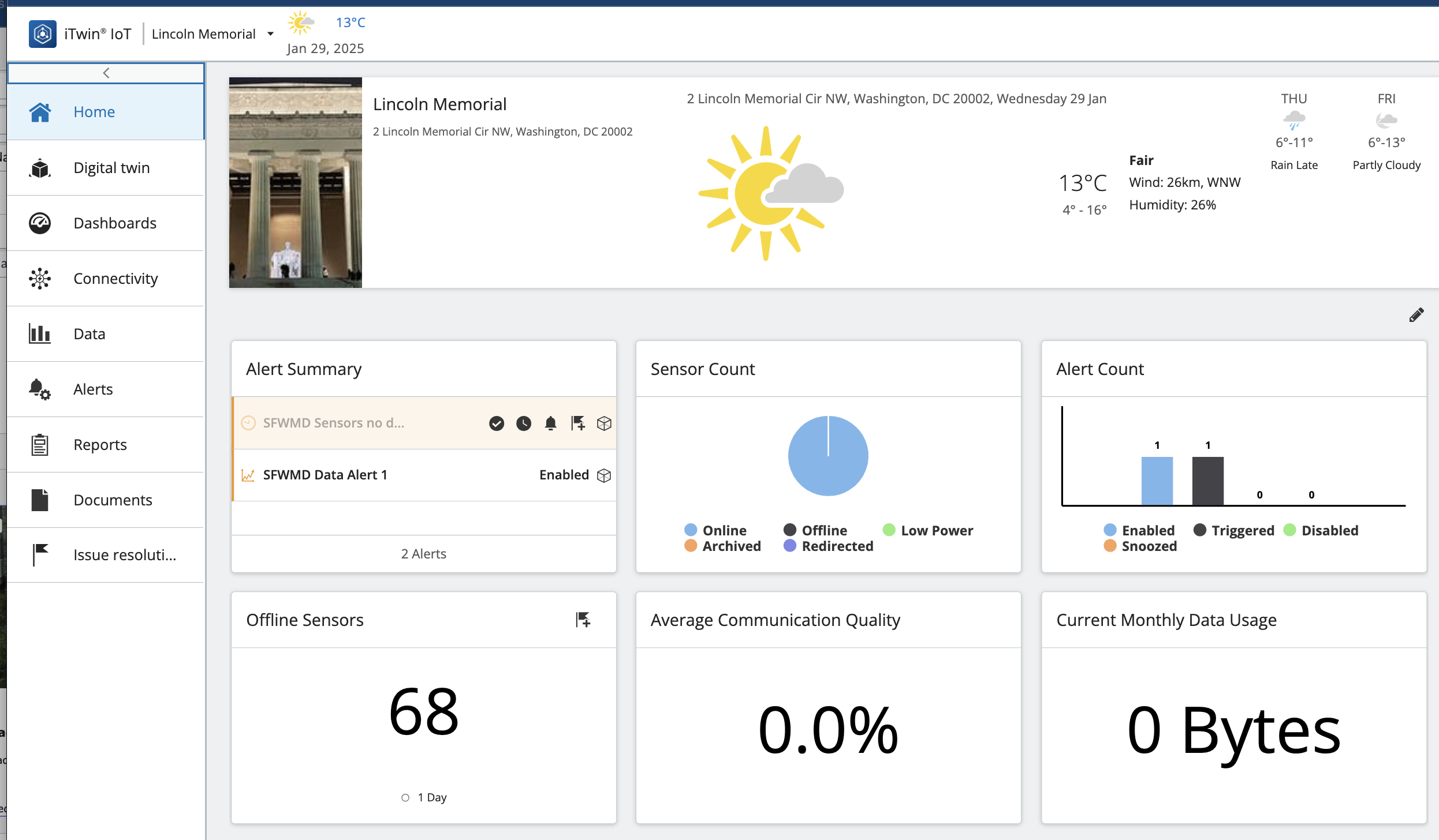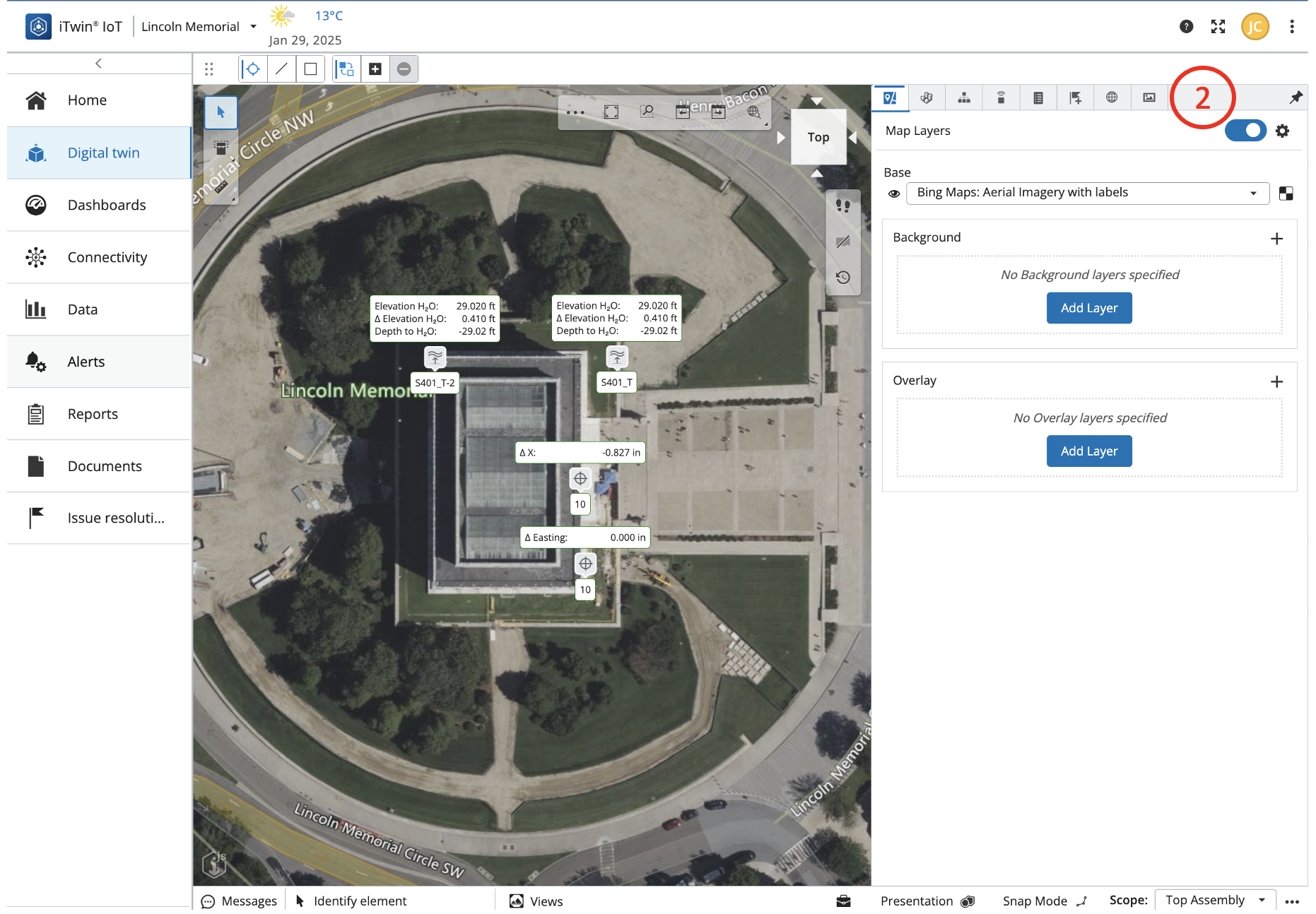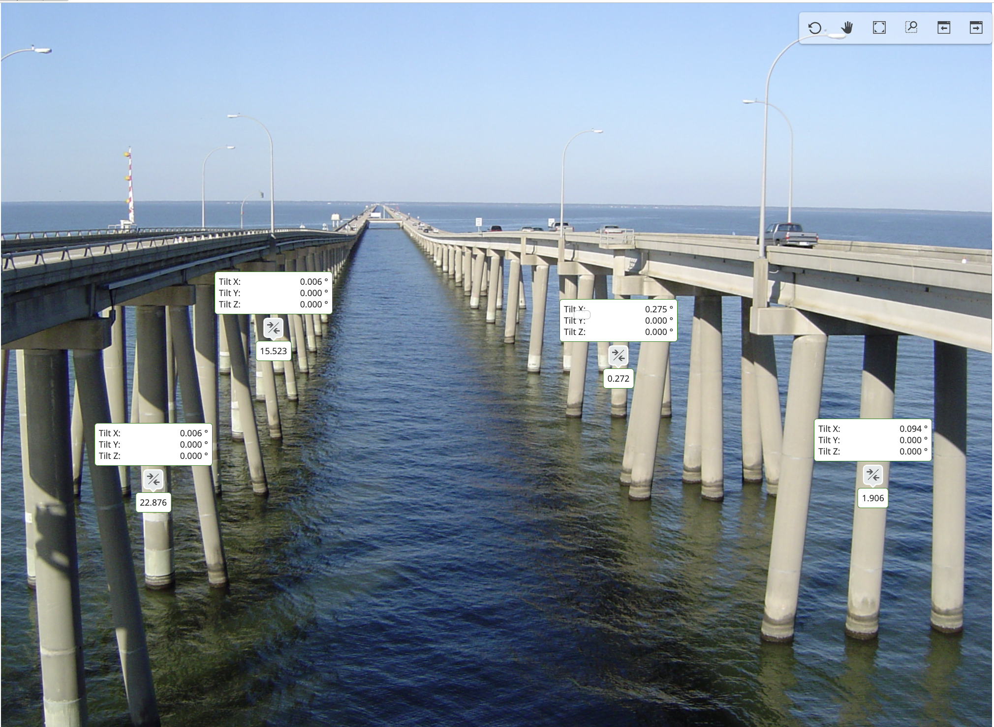 The ImageView tool allows you to upload common image file types (jpg, jpeg, and png) to iTwin IoT for visualization of ground-based photography, aerial images, design plans, or any other 2-dimensional file. iTwin Iot then offers the ability to overlay sensors onto the image and configure then visualize sensor data on the image. An example of a photograph with sensor data overlay from the Image View tool is shown below.