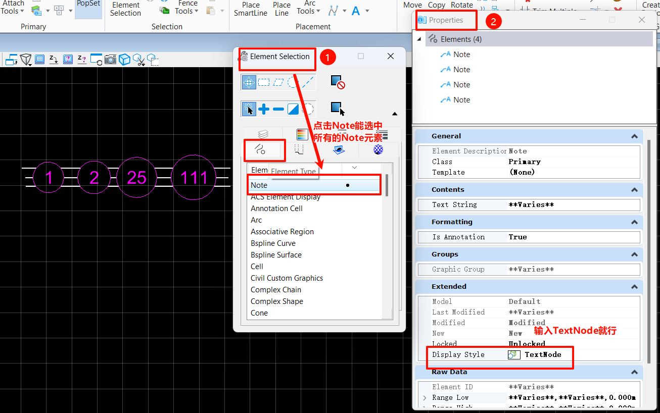 这一步可以在所有的Note元素都放置好后,使用Element Selection工具,在Element Type卡片下,选中Note类型,这样会选中所有的Note元素,然后打开元素的Properties窗口,在Dispay Style对话框中输入上面定义好的名字:TextNode 就可以了,这里其实也可以切换选择,但是测试时发现切换有时候不工作,需要重新打开一次DGN才行;
