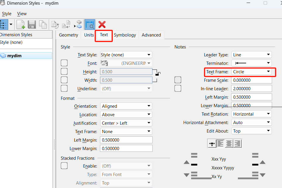 1. 先定义一个Dimension Style:mydim,将Notes下的Text Frame设置成Circle,这样放置的数字批注就是带圈的;