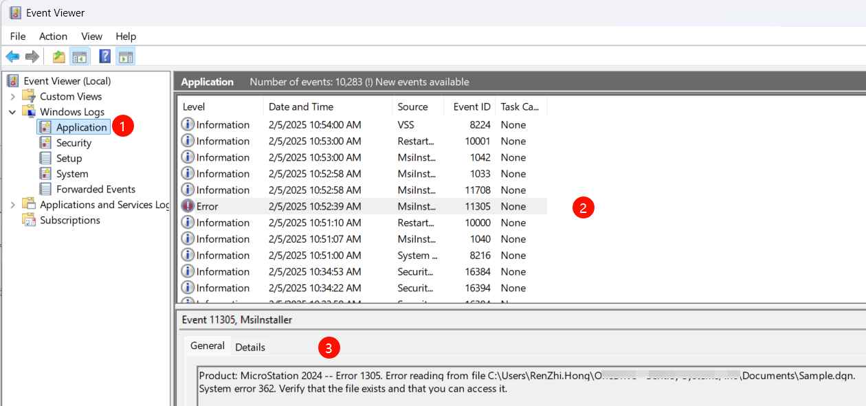 2.如下截图,查找对应报错日志:其中编号2处可以优先查找Error 标识,时间戳以及Source列为MsInst...,从而快速定位
