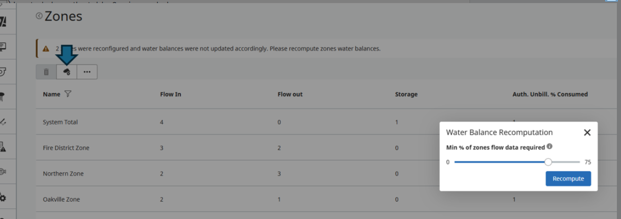 Note that if there are big periods with estimated data, the system input volume might end up not to be calculated as there is not enough data, as by default it requires 75% of the zone flow data to be available during each month (mor or less 23 days per month with zone data). The user can change this default by accessing the Administration >> Zones >> and clicking in the recompute button located on top of the table, as per figure below: