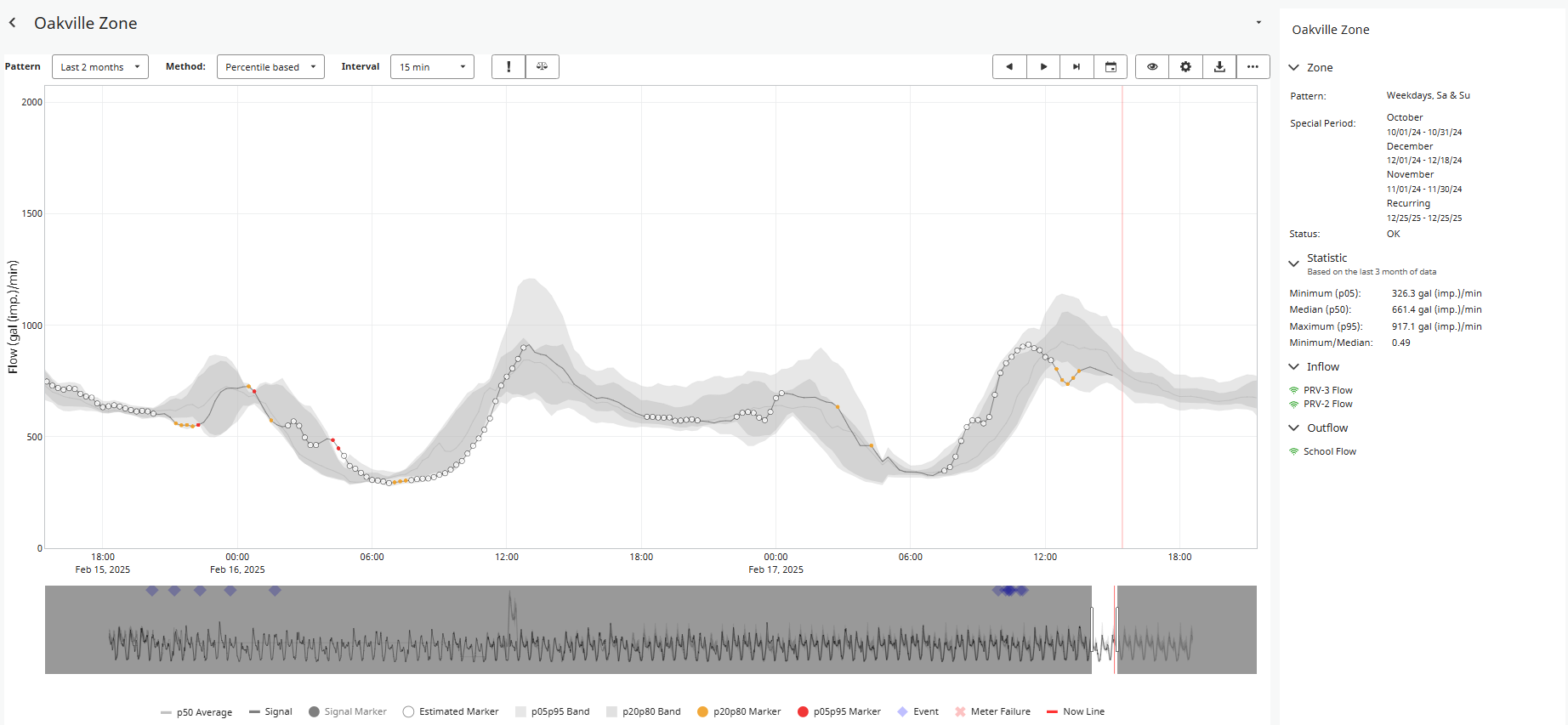 To make those activities more effective, WaterSight uses a powerful algorithm (based on statistical analysis and machine learning) to gap fill data for the zones whenever at least one of the sensor that belongs to the final zone balance fails (no data, flat reading, big spikes due to wrong data, etc). These estimations are based on the sensor pattern values.