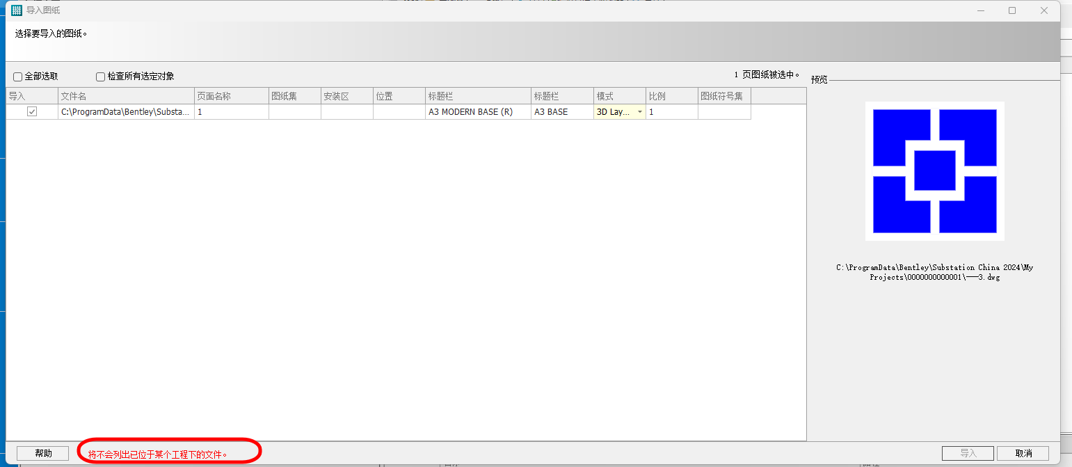 此问题是由于这些需要导入的dgn图纸位于一个工程文件夹下,而Substation默认不能导入工程下的文件。