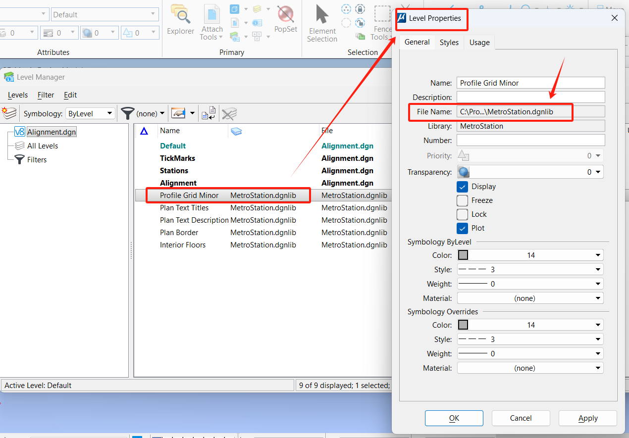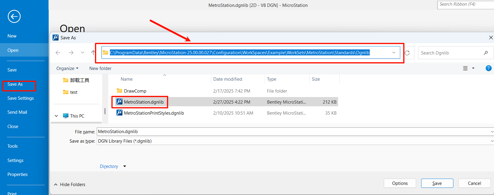 就会启动一个新的MicroStation会话窗口并直接打开这个Level所在的库文件 .dgnlib,然后通过File> Save As菜单就会打开保存文件的对话框,可以查看这个 .dgnlib文件的全路径。查看后不必保存,关掉这个库文件退出这个MS就可以。