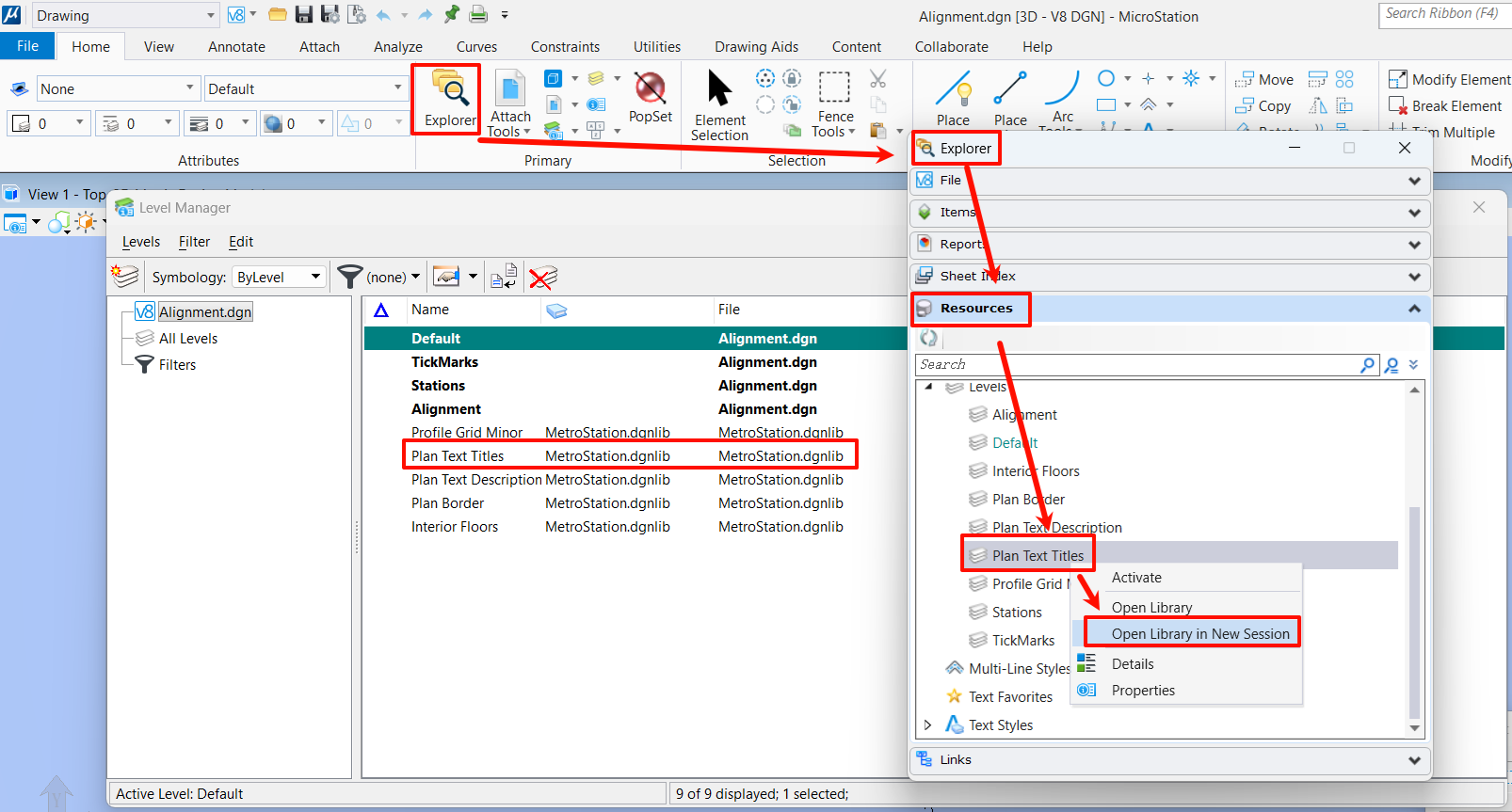在Resources卡片下,展开Levels的层级,可以看到当前DGN文件中的图层和引用的库文件中的所有图层;鼠标右键点击位于库文件中的某个图层,在打开的下拉菜单中点击 Open Library in New Session: