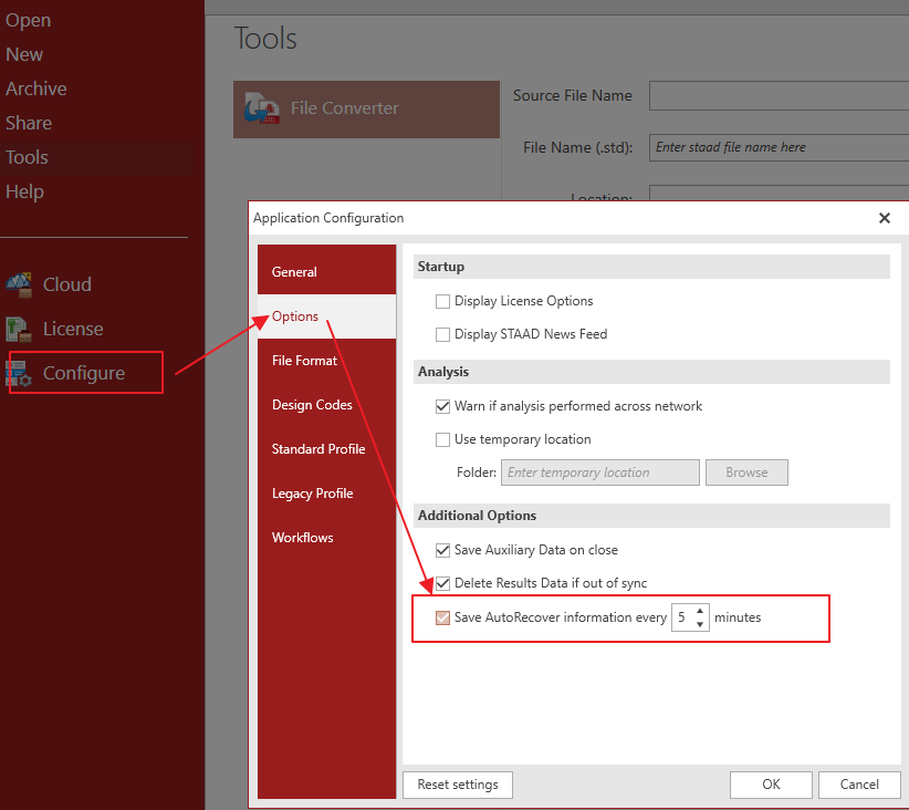 自动恢复功能是STAAD.Pro防止数据丢失的第一道防线。通过定期自动保存std的副本,即使在软件崩溃或电脑意外断电的情况下,也能恢复到最近的自动保存状态。下图是启用自动恢复功能并设置自动恢复备份的频率的位置图示,软件默认此功能是启用的,并且每5分钟保存一次。