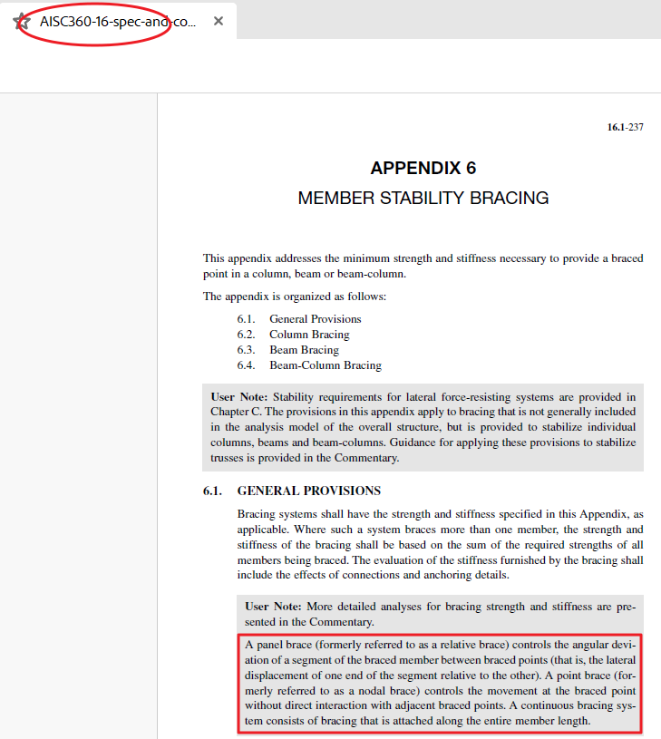 而这里的Relative barcing和Nodal Bracing是美标规范中的一个概念,下面是AISC360-16规范中的一段概念截图: