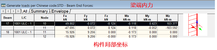 比如支座节点10对应的构件为Beam 10,可以看到 节点10的Fx=49.802kN,说明其方向和构件局部坐标系x方向一致,为向上;
