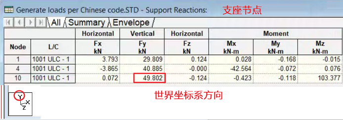 在STAAD.Pro 软件中支座节点输出值的正负是按照世界坐标系的方向来判定的,和世界坐标系正方向一致则为正值,和世界坐标系方向相反则为负值;