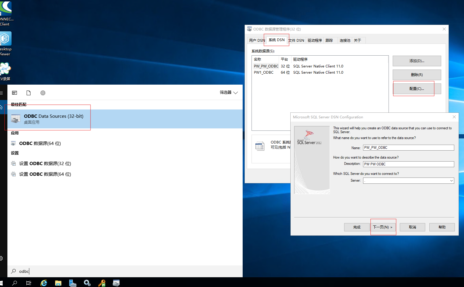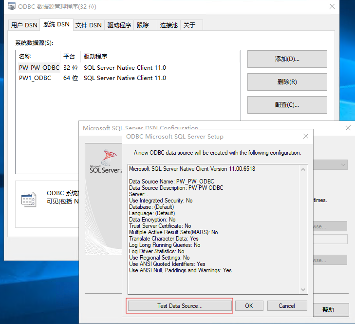 - 您可以从Integration服务器上,搜索ODBC data sources来打开ODBC数据源管理程序,选中第二个标签页系统DSN,选中相应的数据源,点击配置按钮,之后在SQL Server DSN配置对话框中一直点击下一页(过程中可能会需要您输入SQL服务器名,以及数据库的用户名/密码)。最后选择Test Data Source看是否可以测试成功。