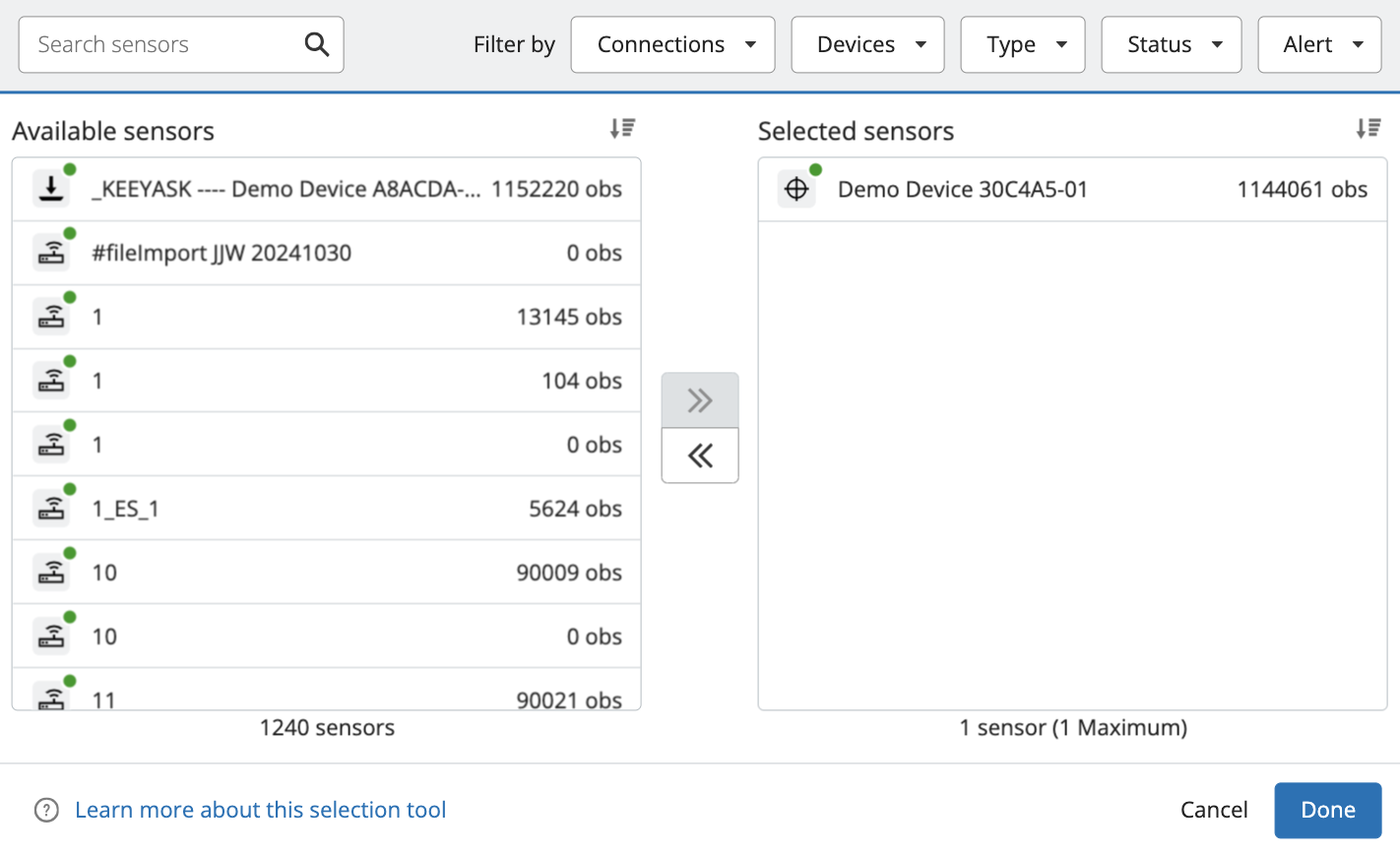 B. Target Sensor Selection- The target sensor is the sensor you will select that you want to compare other sensors against to find potential correlations and relationships. A sensor selection window like the one below will open for you to select the target sensor.