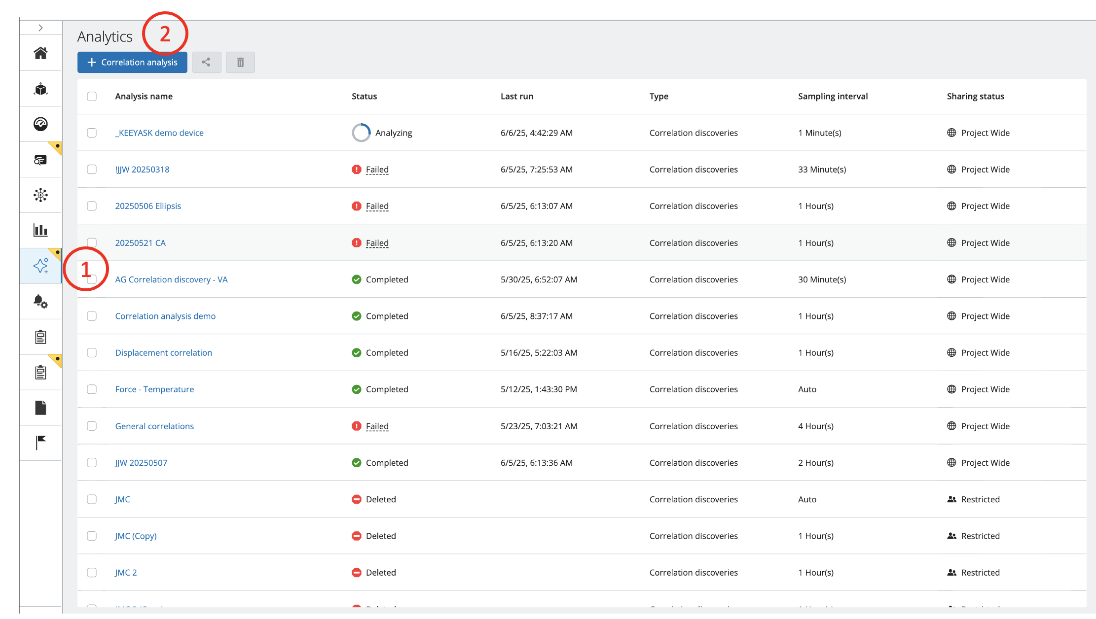 2. To create a new correlation analysis click the blue "+ Correlation Analysis" button at the top of the page. The next screen will be the Analysis configuration screen, an example shown below. We will walk through the configuration options below.