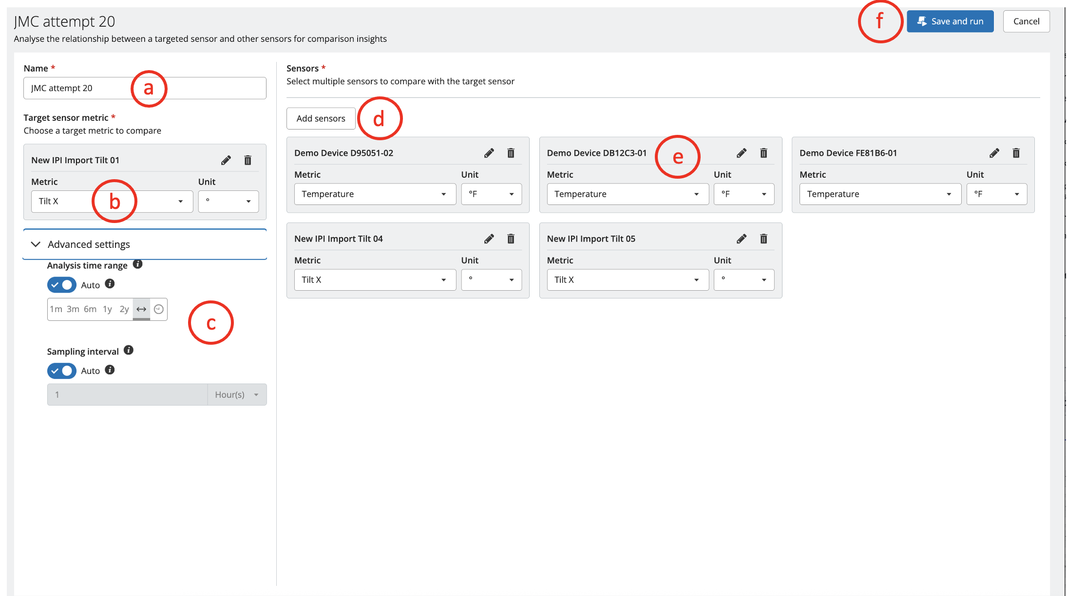 D. Comparison Sensor Selection- The comparison sensors will be the sensors that you wish to run the analysis on to find possible correlations with the target sensor. The same window as the target sensor selection will appear, allowing you to select up to 25 sensors to analyze against the target sensor.