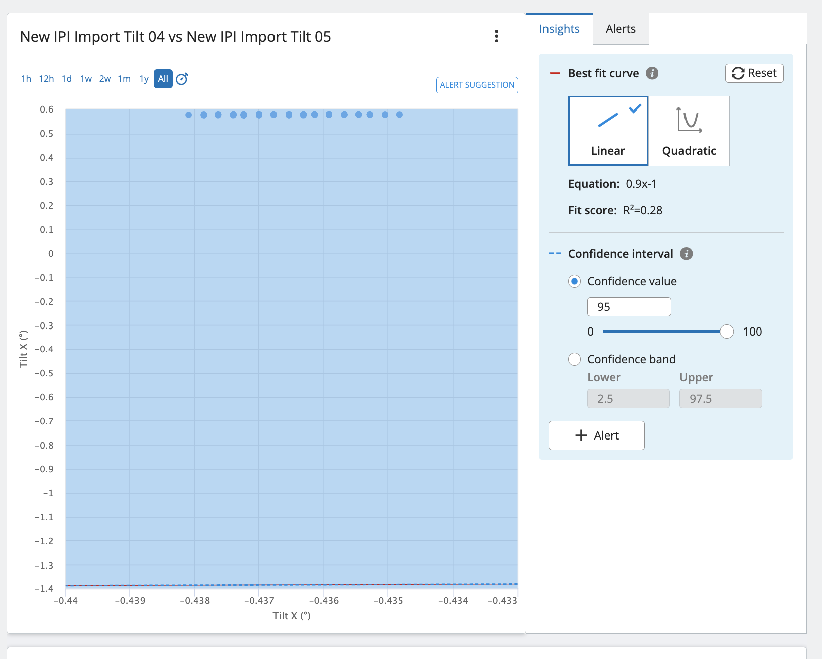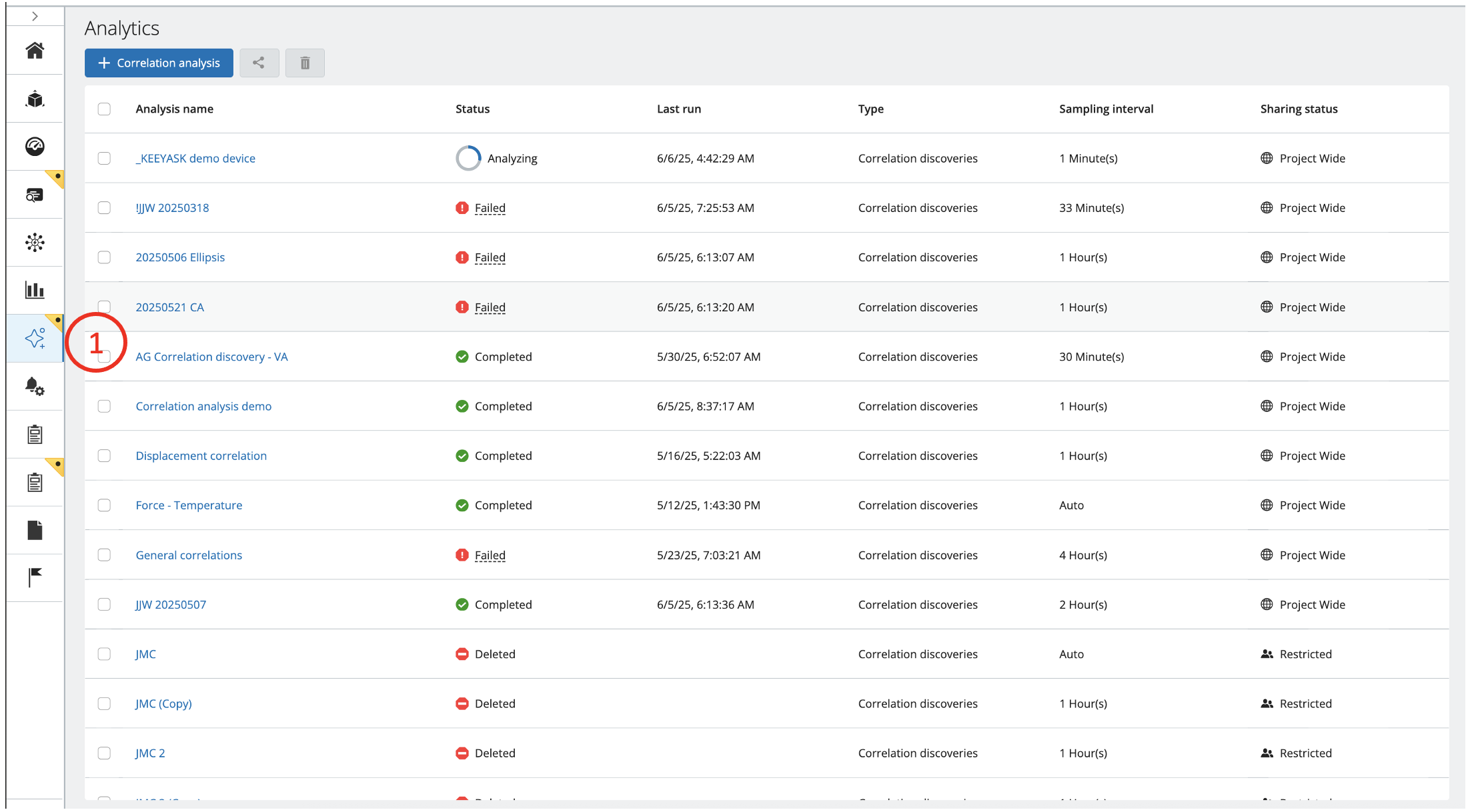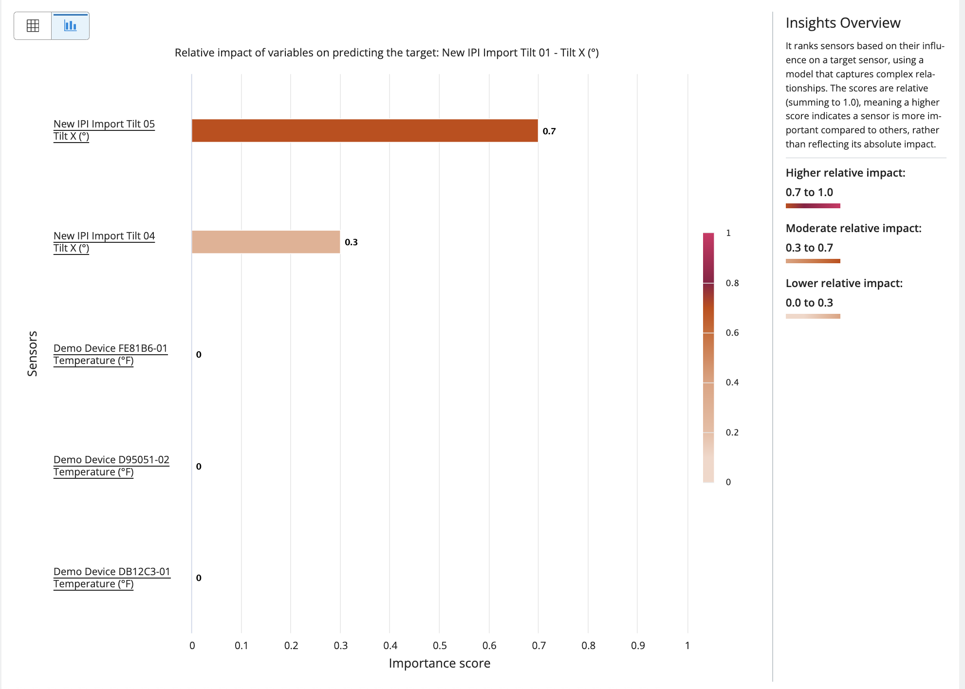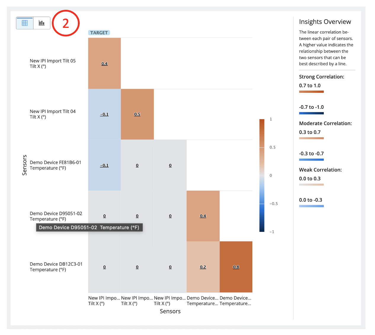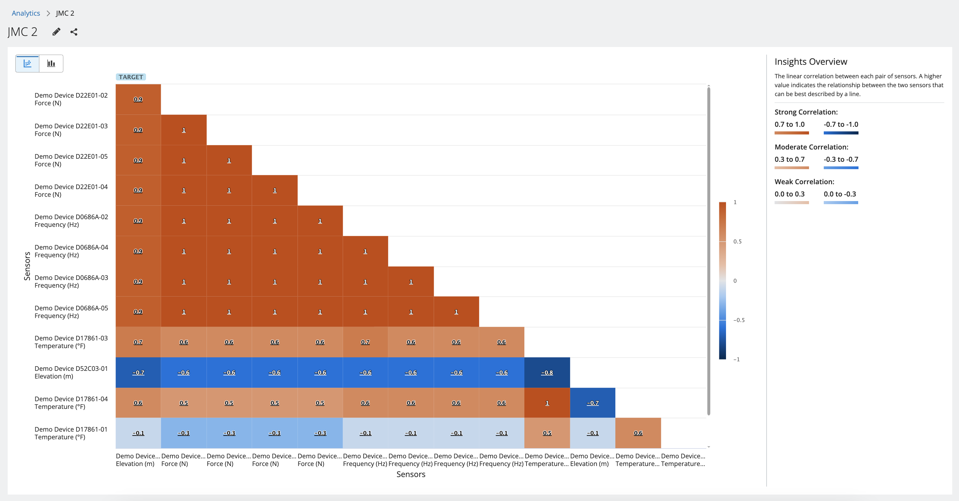 You will be brought directly to the Insights Overview heatmap, which provides quick insight into the linear correlation strength of sensors in the analysis. The legend can be seen on the right side of the screen, indicating that red shades are positive correlations and blue shades are negative correlations, and the hue indicates the strength of the correlation.