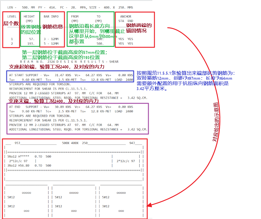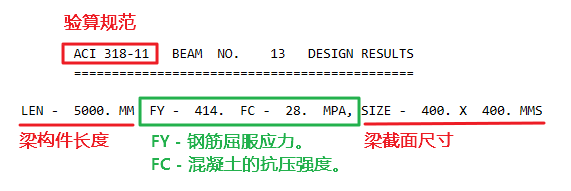 混凝土梁构件分析设计后,其output file中将输出如下梁设计结果如下,其对应参数的解释将如下注释: